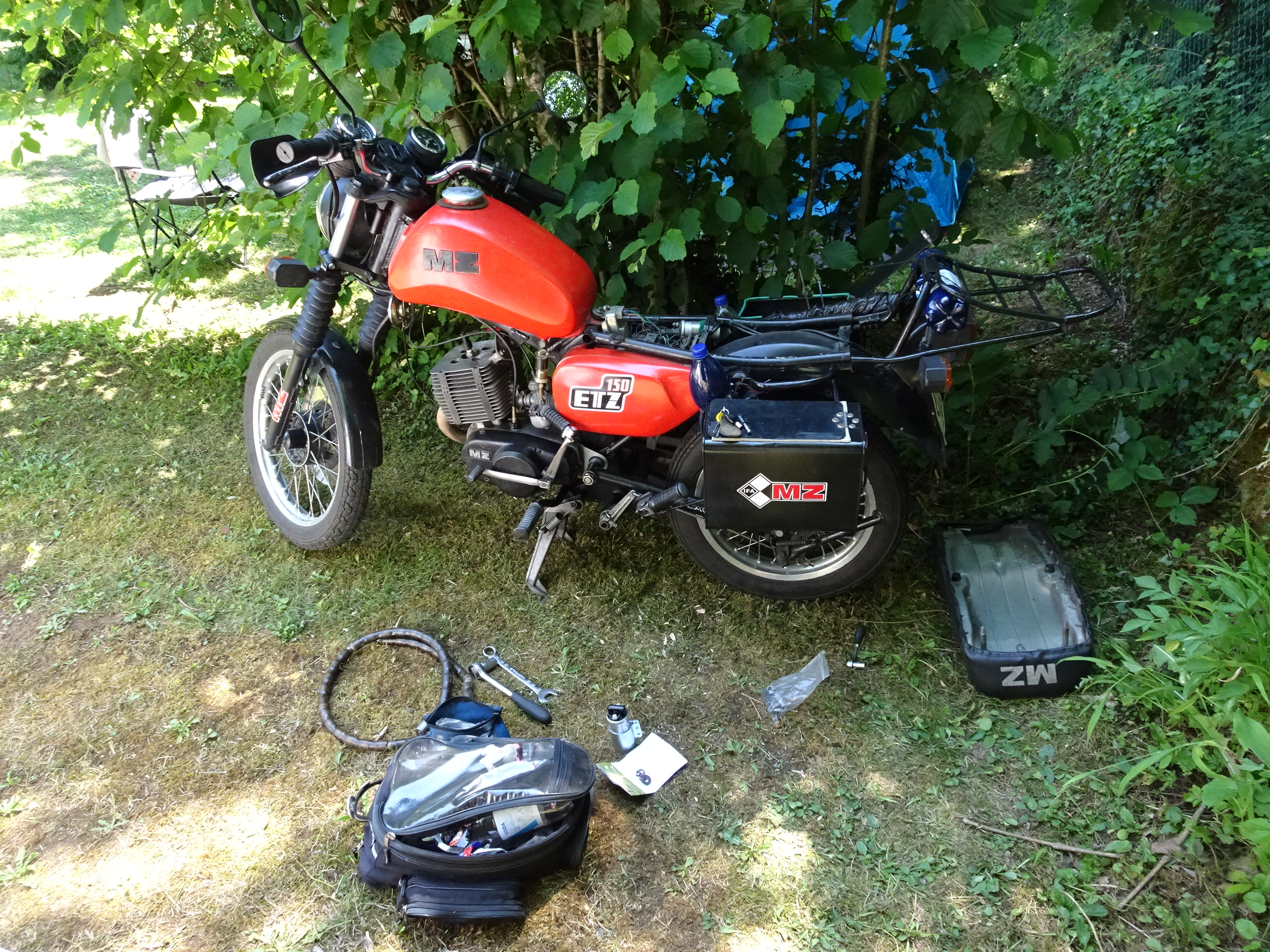 První den jsem jel přes Německo a částečně Rakousko k Bodamskému jezeru do Švýcarska, kde jsem přespal u bývalého kolegy z práce. Pak jsem přes Německo pokračoval do Francie, kde jsem byl dva dny v kempu u vodopádů Herisson. Tam jsem také měnil u MZty zapalovací cívku, protože mi už delší dobu blbne (jakmile není svíčka 100% ok, tak motorka vynechává, zvláště ve vedrech, které ve Francii byly). Během výměny jsem ztratil pérovou podložku pod cívku, což jsem považoval za zbytečnost a dál to neřešil.