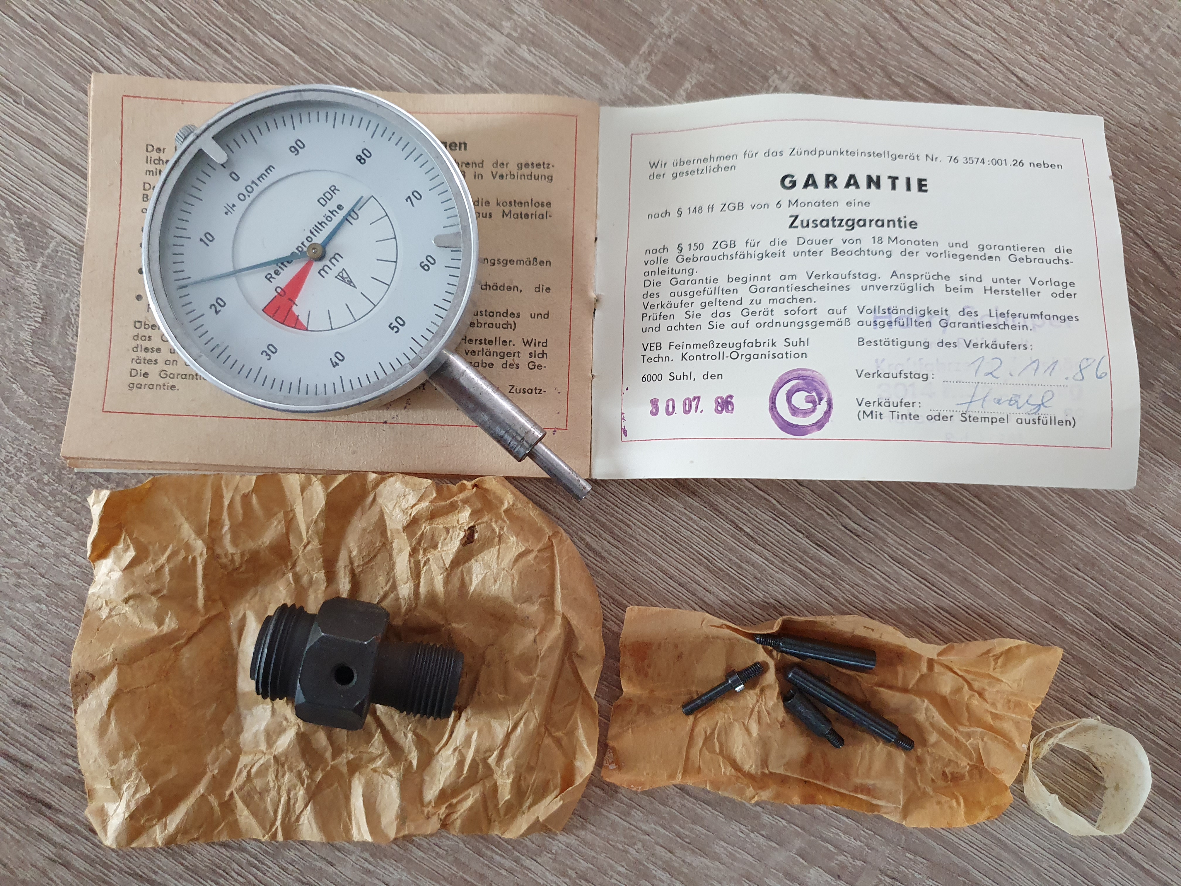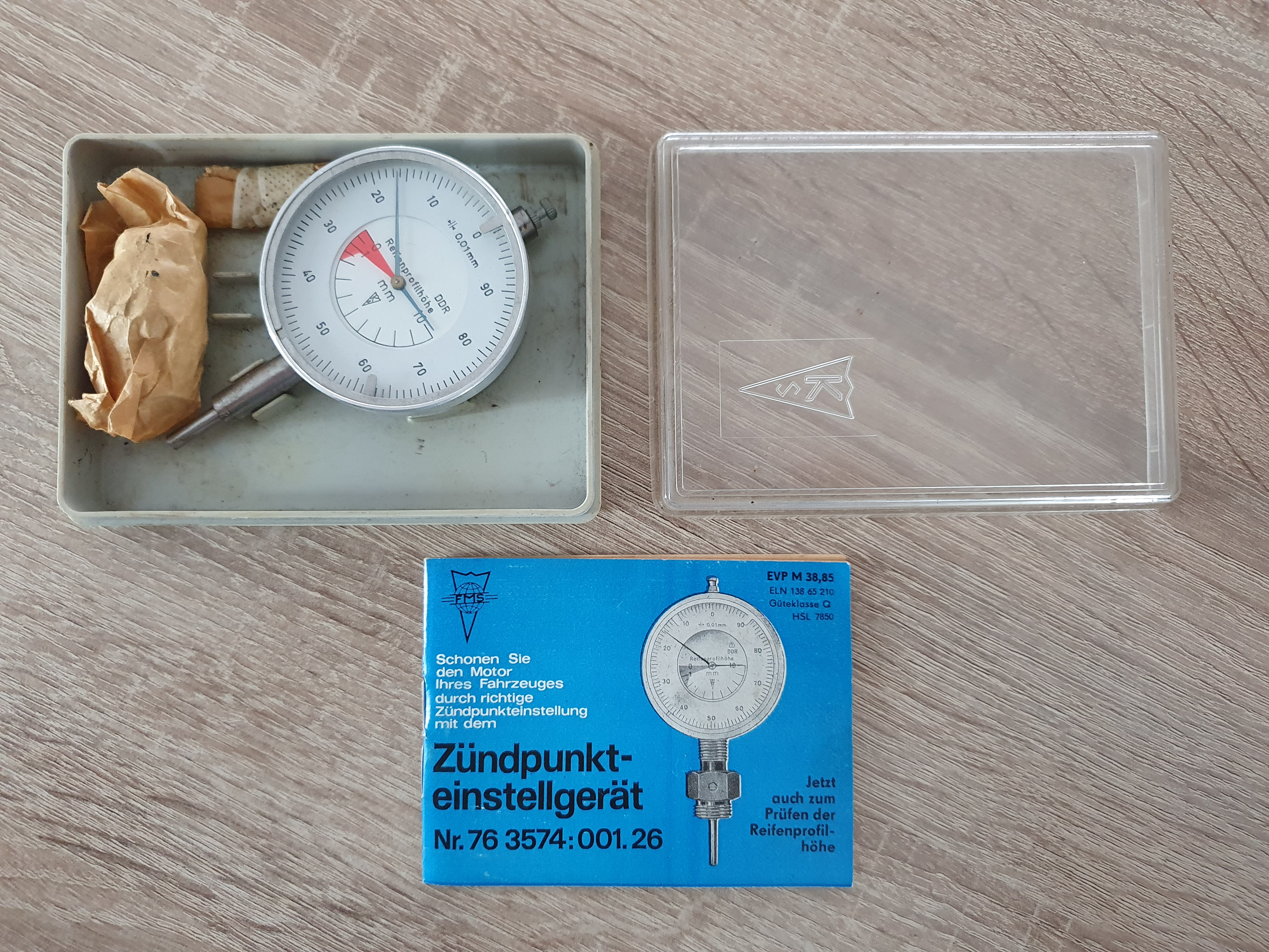 Originální měřák předstihu, úchylkoměr pro měření úvratě pístu. Perfektní stav, původní balení, vše 100%. Cena 2.500,-